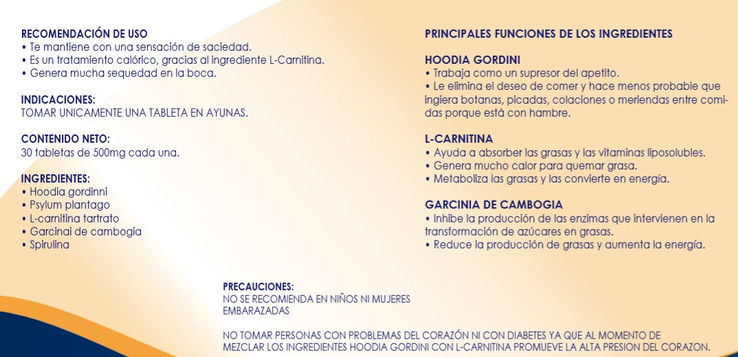 No tomar personas con problemas del corazón ni con diabetes ya que al momento de mezclar los ingredientes Hoodia Gordini con L-carnitina promueve la alta presión sangínea.